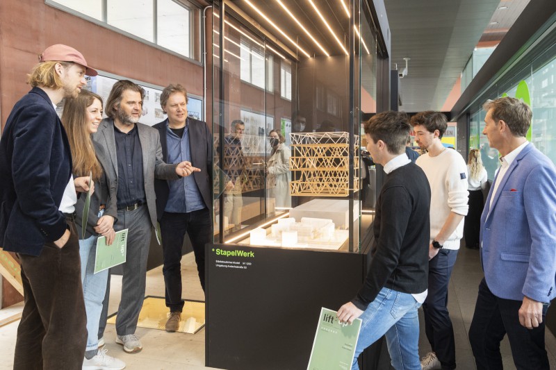 Das Projekt „StapelWerk“ überzeugte die Jury und wurde mit einer Auszeichnung belohnt. Das Modell des Projekts wird von den Preisträgern und Arch. DI Thomas Thaler (3.v.l.), assoz. Prof. DI Andreas Flora (4.v.l.) sowie Karl-Heinz Eppacher (r.) begutachtet.