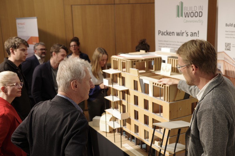 Zuerst präsentierte Philipp Zingerle, Holzbaufachberater bei proHolz Tirol, mit dem Thema: „Holzwohnbau für alle: Planungstools aus dem Interreg-Projekt BIGWOOD“, wirtschaftliche und robuste Lösungen für den Bau mehrstöckiger Wohnhäuser. Anhand eines detaillierten Modells stellte er anschaulich vor, in welcher Herangehensweise hier zukunftsträchtig und nachhaltig agiert werden sollte, und ermöglichte den Zusehern dadurch einen illustrativen Einblick in das derzeit „potenziell Umsetzbare“, ohne jedoch auf praktische, bereits realisierte Beispiele zu verzichten.