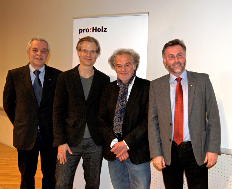 v.l.n.r.: Ehrenvorsitzender proHolz Tirol Hermann Wurm, DI Matthias Marschner, DI Dr. Martin Riehl, beide hirner und riehl, München, DI Rüdiger Lex, Geschäftsführer proHolz Tirol.