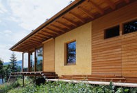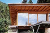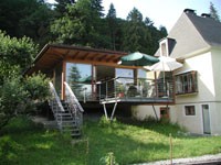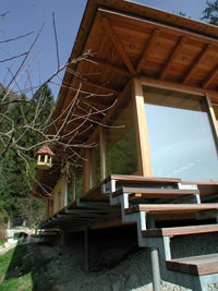 Im Zuge der Familienerweiterung plante die Familie Rucker ihr altes Haus, um einen Neubau zu ergänzen. Das am Hang stehende Althaus und die alte Garage wurden um einen schwebenden Neubau in Holzskelettbauweise erweitert. Die Gartenmauer und die Garage wurden in die Planung miteinbezogen. Der Anbau ist eine reine Zimmermannskonstruktion. Die Grundkonstruktionselemente bestehen aus Lärchenleimholz in verschiedenen Dimensionen. Süd- und westseitig öffnet sich die Konstruktion im gesamten Wohnbereich durch raumhohe fixverglaste Elemente und durch Schiebetüren. Die Fenster der Nordseite sind auf die bestehende alte Gartenmauer aufgesetzt worden. Nordseitig schließen ein Behandlungsraum mit Bad (ehemals Garage) eine Werkstatt und eine offene Holzlage an den Baukörper an. Der Anbau ist auskragend und steht auf zwei Eisenstützen. Ein auskragender Terrassenteil umfasst das Gebäude. Die Grundbeheizung des Objektes erfolgt durch eine Pelletsheizung. Im Neubau ist lediglich eine Wandheizung im Wohnzimmer vorgesehen. Die Gebäudeinnenwand wurde mit einem Lehmputz versehen, der extrem feuchtigkeitsregulierend wirkt. Alle Gläser sind 3-fach Isolierverglasungen mit einem k-Wert von 0,6. Vor der Südfassade und Westfassade sind Holzrolläden vorgesehen. Die Dämmung des Bodens und der Deckenkonstruktion erfolgte mit Isocell. Es wurden nur biologisch unbedenkliche Baustoffe verwendet, sodass auch die Holzbauteile gänzlich unbehandelt sind. Die Qualität der ausgeführten Elemente ist hervorragend.