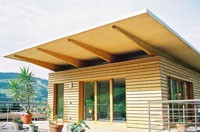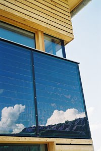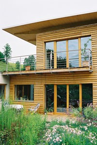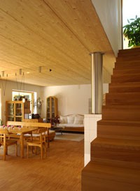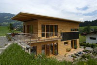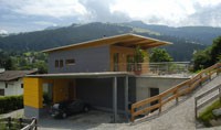 Bereits zu Beginn der Planung standen die Eckpunkte fest: moderne Holzarchitektur, bester Dämmstandard, ökologische Materialien und neue Energietechnik - das Ergebnis ist ein beispielhaftes Passivhaus in Holzbauweise. Das Gebäude besteht aus einem in Holzrahmenbauweise errichteten Erd- und Obergeschoss. Der anschließende Keller verschwindet zur Gänze im Hang. Im zurückgesetzten Obergeschoss befindet sich eine Büroeinheit mit eigenem Zugang. Das Obergeschoss kann später mit geringen Umbauten zu einer eigenen Wohneinheit umfunktioniert werden. Der Baukörper orientiert sich klar nach Süden: Große Fensteröffnungen geben nicht nur den Blick auf eine herrliche Berglandschaft frei, sondern lassen auch Licht und Sonne in die Räume. Aktiv wird die Sonne über 10,5 m² Fassadenkollektoren für Warmwasser und Heizung genutzt. Das Erdgeschoss ist behindertengerecht ausgestattet, Keller und Technikraum können stufenlos erreicht werden. Auf eine Garage wurde bewusst verzichtet, stattdessen befinden sich an der Nordseite zwei überdachte Stellplätze, die gemeinsam mit dem Blumenraum einen wettergeschützten Eingangsbereich schaffen. Im Innenraum sind die Vorteile von Holz besonders wichtig: Regulierung der Raumfeuchte, angenehm warme Oberflächen, keine Schadstoffe, die an die Raumluft abgegeben werden können. Holz wurde auf vielfältige Weise eingesetzt: Im gesamten Wohnbereich wurde ein Buchenstabparkett (gedämpft) verlegt, die Innentreppe aus Buche ist auf einer massiven Speicherwand aufgesetzt, die Holzroste im Bad und auf den Terrassen sind naturbelassen. Für das Mobiliar wurde ausschließlich Vollholz (nur geölt) verwendet. Alle Bauteile wurden vorgefertigt auf der Baustelle angeliefert und in 2 Tagen errichtet. Auf Wärmebrückenoptimierung und beste Luft- und Winddichte wurde besonders geachtet.