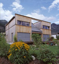 Das Wohnhaus der Familie Förg-Baumgartner in Zirl zeigt einen Holzkubus, der durch eine schiefe Ebene eine dreiteilige Gliederung erhält. Das energetische Konzept aus Solaranlagen kombiniert mit einer Pelletsheizung entspricht dem Niedrigenergiehausstandard.