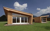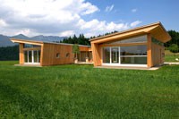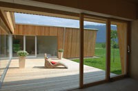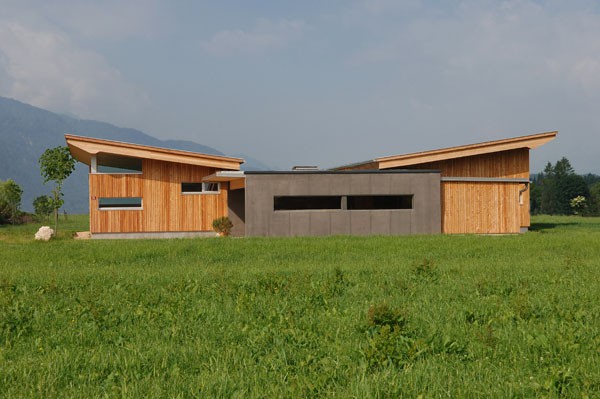 Das Atriumhaus Scharnagl in Kirchbichl in Holzbauweise setzt in seiner modernen Art einen Kontrast zu den nebenstehenden landwirtschaftlichen Gebäuden der Bauherren. Großzügige Räume und großflächige Glasfassaden binden die Natur in den Wohnalltag der Bauernfamilie ein. Das Wohnerlebnis wird zum Naturerlebnis. Der offene, aber windgeschützte Innenhof besticht durch seine Lage Richtung Sonnenuntergang und vermittelt südländisches Flair, das durch die Bepflanzung und die Holzatmosphäre verstärkt wird.