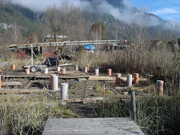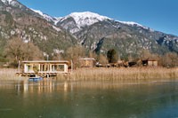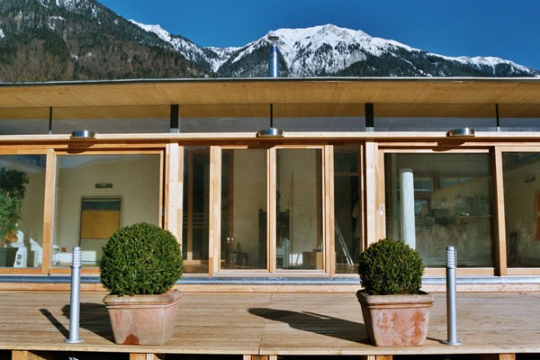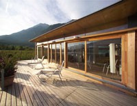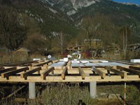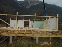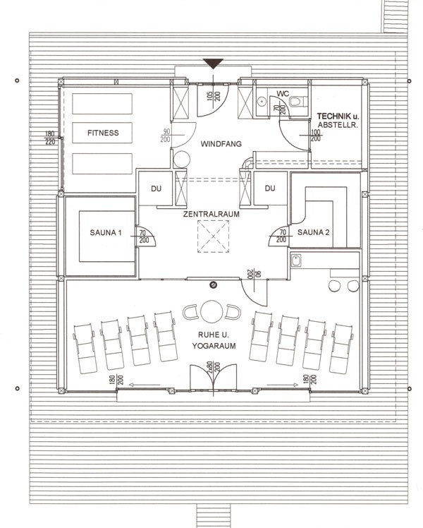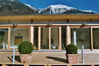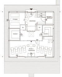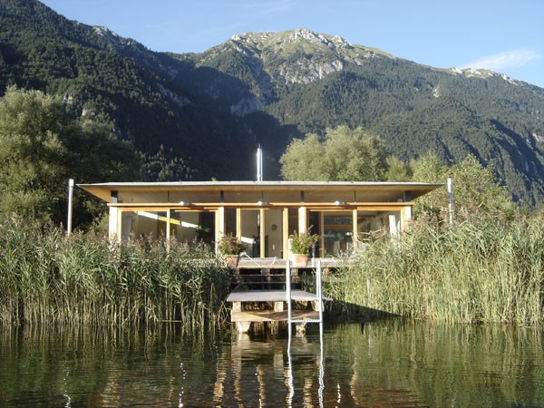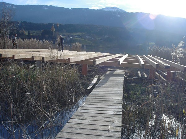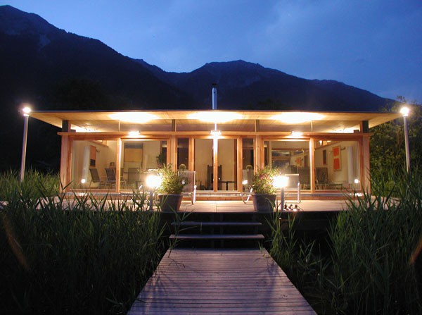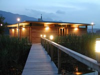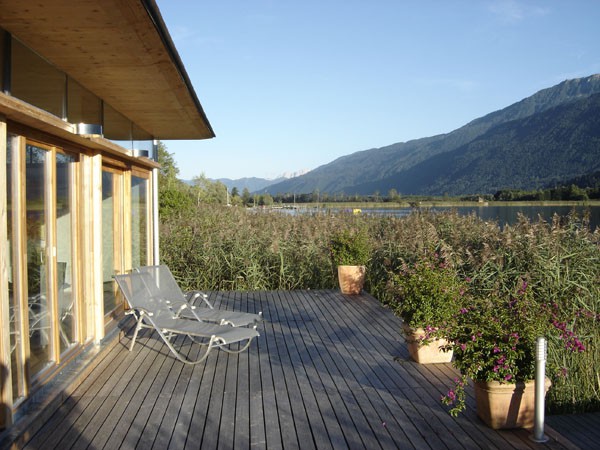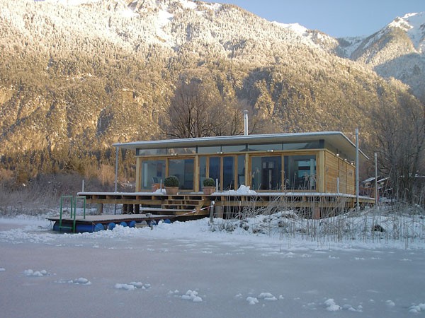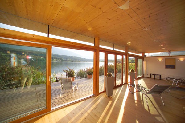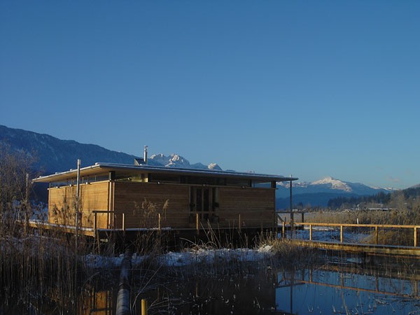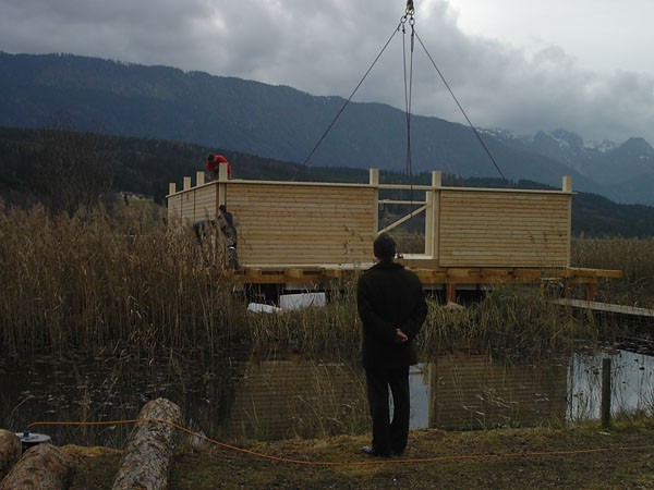 Familie Richter wollte ihren Gästen den attraktivsten Standort für die Einrichtung des neuen Saunahauses bieten und man entschied sich für eine dem Areal vorgelagerten kleinen Insel, welche nur über einen schwimmenden Steg erreicht wird. Aufgrund des steigenden und sinkenden Wasserspiegels entschloss man sich, das Gebäude auf Schwimmkörpern zu setzen, sodass bei ansteigendem Wasser - wenn ein Anstieg von mehr als 60 cm erreicht ist - das Saunahaus „mitschwimmt“. Um ein Davonschwimmen zu verhindern, wurde es an den vier Eckpunkten mit horizontalen Ringen verankert, welche die Höhenbewegung des Gebäudes mitmachen. Alle Anschlüsse an das Ver- und Entsorgungsnetz inklusive der Abwasserleitungen mussten daher flexibel bzw. dehnbar und beweglich ausgeführt werden. Was die Baumaterialien anbelangt, wurde dem Naturschutzgebiet entsprechend natürlich hohes Augenmerk auf ökologische Baustoffe gelegt. Im Grunde besteht das gesamte Gebäude fast ausschließlich aus Lärchenholz und Steinfliesen. Bauzeit: 8 Wochen Baukosten: ca. EUR 240.000,-