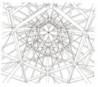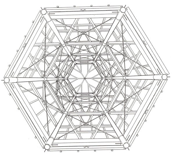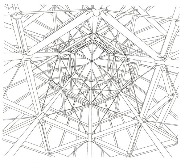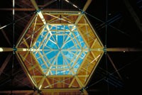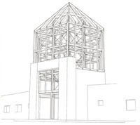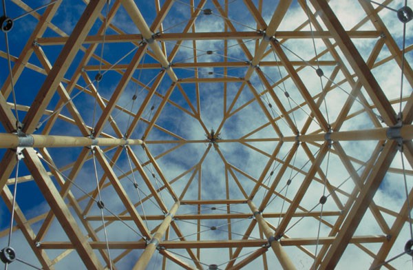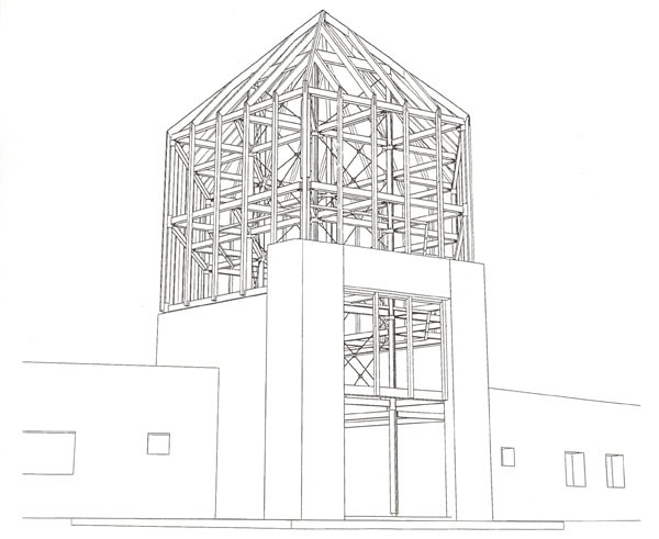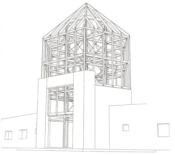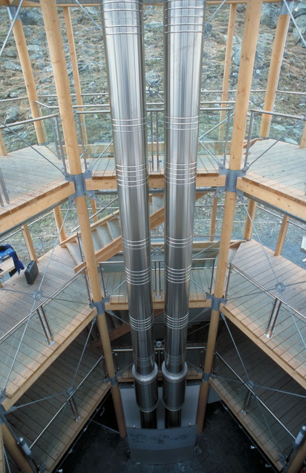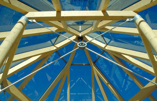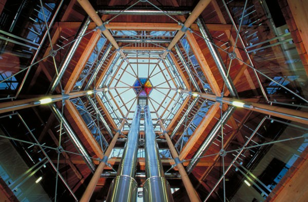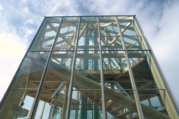 Das Gebäude besteht insgesamt aus vier Ebenen, wobei das Erdgeschoss und 1. Obergeschoss fast zur Gänze geschlossen sind. Die zweite Ebene ist weitgehend aufgeglast, die dritte ist mit dem Glasdach vollkommen transparent. Alle Ebenen oberhalb des Erdgeschosses sind als Galerien mit sechseckigem Luftraum in der Mitte ausgebildet. In den unteren beiden Geschossen wird eine Natursteinmauer als Gebäudehülle vor das Holzskelett gesetzt. Die oberen Geschosse werden vollkommen verglast.