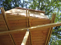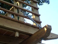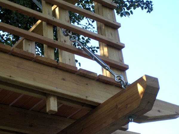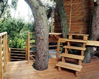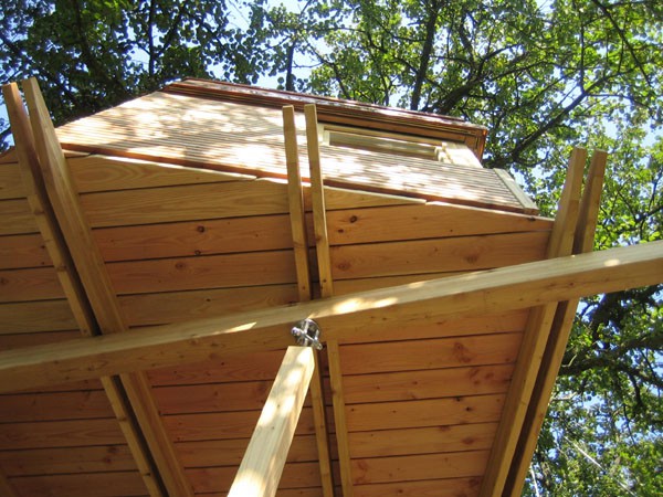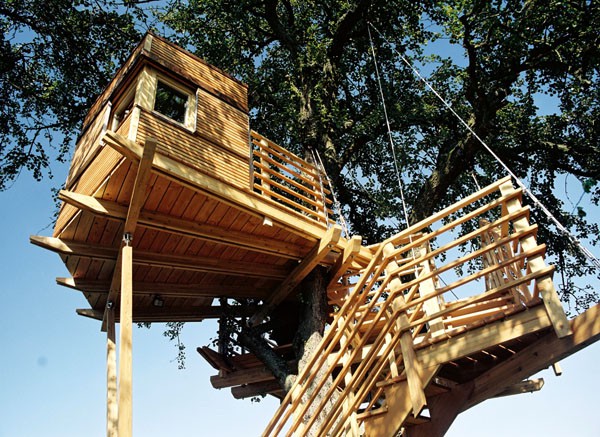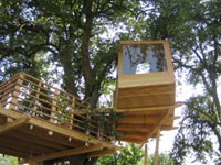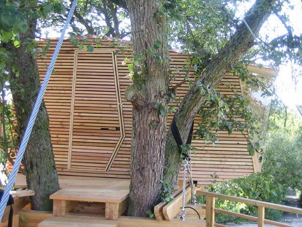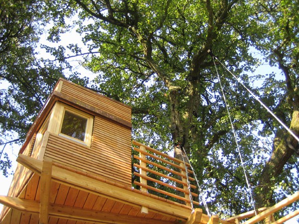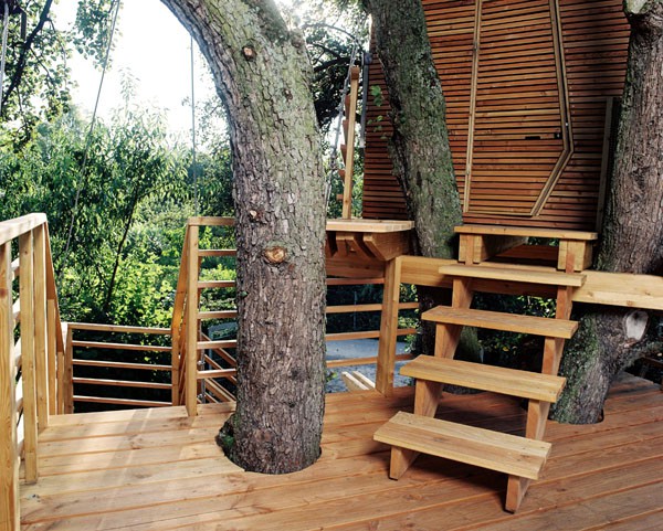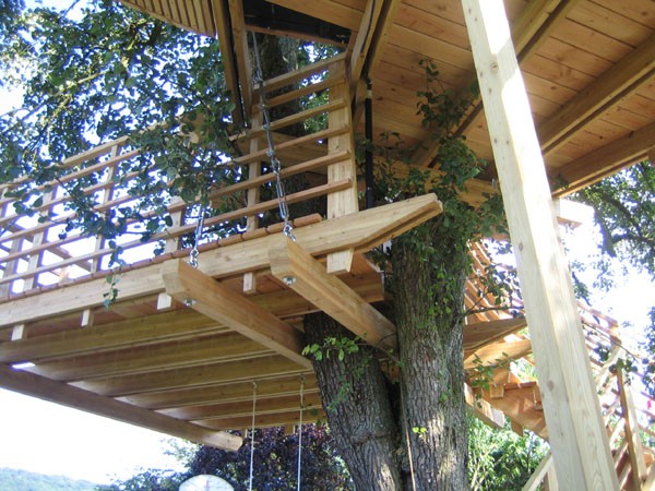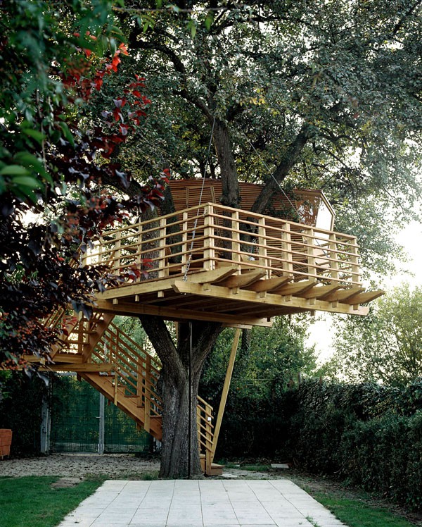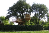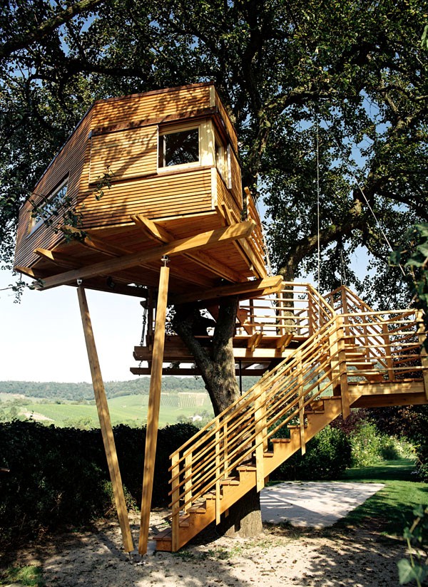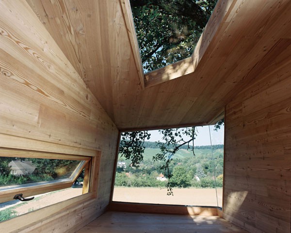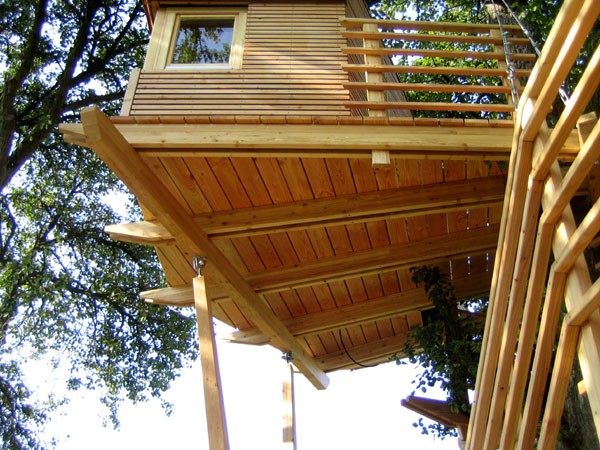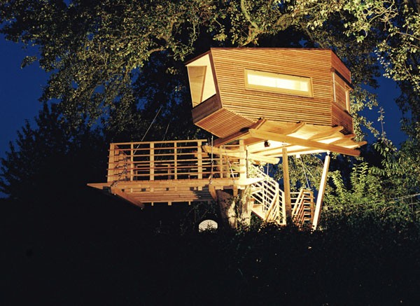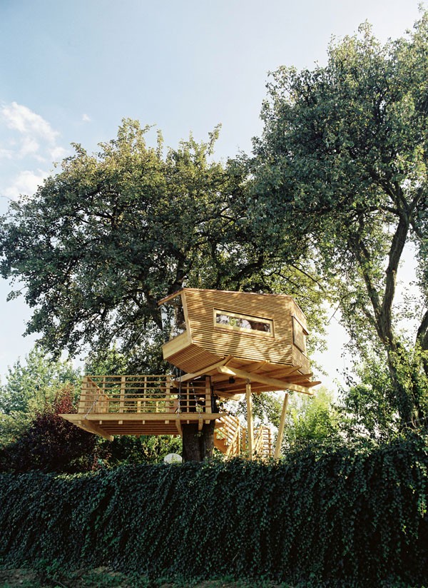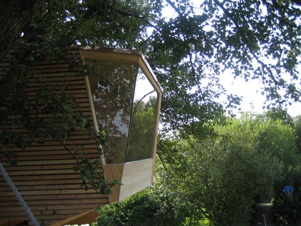 Das Baumhaus am Äckerle ist in einem großen Birnenbaum in Heilbronn, Deutschland erbaut worden. Über eine komfortable Treppe gelangt man durch eine Astgabel hindurch auf die schräg zulaufende Terrasse in 3,5m Höhe. Die Treppe sowie die Baumhausterrasse sind komplett mit Stahlseilen und Textilgurten am Birnbaum abgehängt. So wurde der Baum an keiner Stelle durch Bolzen oder Schrauben verletzt. Die Terrasse bietet genügend Raum für einen Tisch und Stühle für mehrere Personen. Hier ergibt sich auch ein traumhafter Blick in ein Seitental mit Weinbergen. Von der Terrasse gelangt man über eine kleine Stiege in das ein Meter höher gelegene Baumhaus. Da der Birnbaum nicht alle Lasten des Baumhauses tragen kann, ist ein Teil der Konstruktion auf zwei schräge Stützen aufgelagert worden. Das Baumhaus besitzt umfangreiche Verglasungen an allen Seiten, ein großes Dachfenster sowie Sonnenschutzelemente gegen Süden. Auf besonderen Wunsch des Bauherrn kann ein Teil des Terrassengeländers abgesenkt werden. Somit können zu Übungszwecken auch von der Baumhausterrasse Golfbälle zur benachbarten Rasenfläche abgeschlagen werden. Der Innenausbau des Baumhauses besteht aus einer großzügigen Liegefläche, einer gegenüberliegenden Sitzbank und einem Klapptisch. Unter der Bank- und Liegefläche befinden sich Schubkästen aus dunkel beschichtetem Sperrholz. Von der Liegefläche ergibt sich wiederum der Blick auf den nahe gelegenen Weinberg.