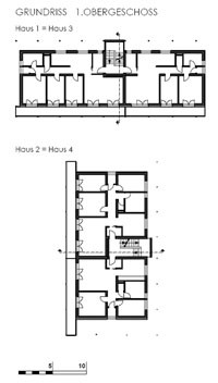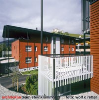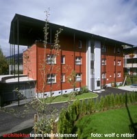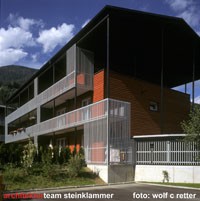 Die Wohnanlage in Heinfels (4 Häuser mit insgesamt 24 Wohneinheiten) wurde auf ausdrücklichen Wunsch der Gemeinde und des Bauträgers in Holzbauweise ausgeführt. Zum Einsatz kam massives Kreuzlagenholz für alle Außenwände und tragenden Innenwände und Brettstapeldecken mit gehobelter Untersicht. Die nichttragenden Innenwände sind Gipskarton-Ständerwände, ebenso sind alle sonstigen Wände mit einer Gipskarton-Vorsatzschale versehen. Im Wohnbereich wurde ausschließlich Parkettboden eingesetzt. Das Stiegenhaus ist aus statischen Gründen in Stahlbeton ausgeführt. Die Fassade ist hinterlüftet und zeigt eine horizontale Stülpschalung. Die Bretter sind sägerauh (Gattersäge!) und mit einer roten Dickschichtlasur versehen. Die vom Bauherrn gewünschten großen Dachvorstände wurden aus gestalterischen Gründen in ihren Ausmaßen noch gesteigert, die Traufenlinie wurde sodann durch schlanke, schwarze Stahlstützen getragen – so entsteht ein „Zwischenraum“ vor der Fassade. Auf der Südseite sind durchlaufende Balkone, welche die Süd- bzw. Westfassade vor zuviel Sonneneinstrahlung schützen.