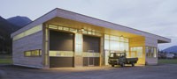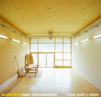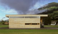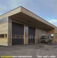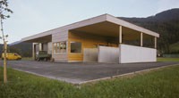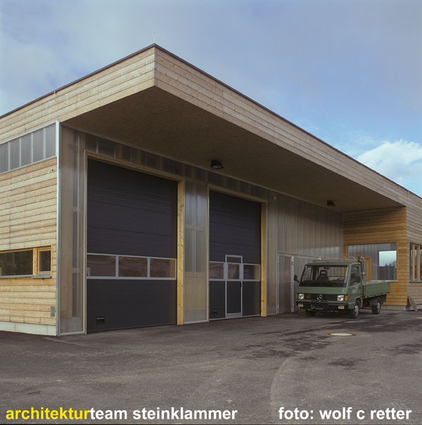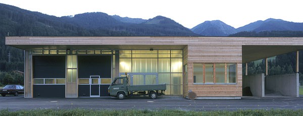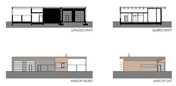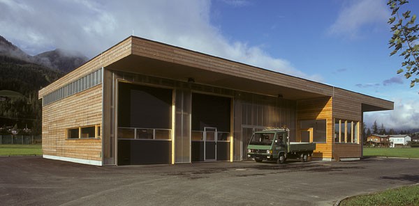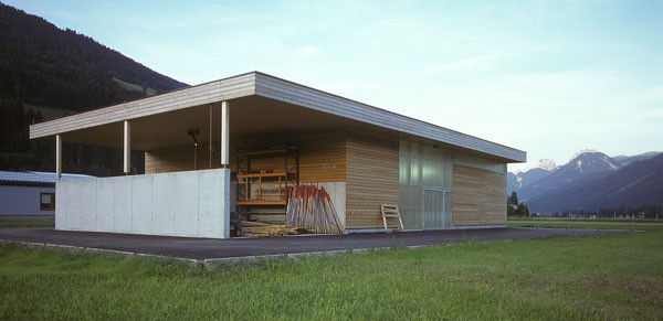 Ein reiner Zweckbau, der ursprünglich „alleine“ auf „der grünen Wiese“ stand; Holzfassade unbehandelt; eine Holzkonstruktion abgestützt auf einem massiven Stahlbetonkern (Personalaufenthaltsraum, Heizung).