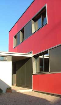 Die Eckpunkte der Planung waren von Anfang an klar: moderne Holzarchitektur, sehr kurze Bauzeit, bester Dämmstandard, ökologische Materialien, modernste Energietechnik. Diese Zielsetzungen führten zu einem Passivhaus in Holzbauweise. Der Baukörper orientiert sich nach Süden: große Fensteröffnungen lassen Licht und Sonne in die Räume. Das Erdgeschoss ist als eigenständige Wohneinheit konzipiert und somit kann bei Änderungen der Nutzeranforderungen mit wenigen Eingriffen das Obergeschoss umfunktioniert werden.