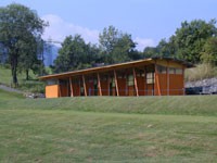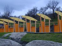 Dieses Projekt zeigt in origineller Art und Weise die Anwendung von diversen Holzwerkstoffen. Die Tragkonstruktion bilden Stützen aus Lärchenholz und gebogene Träger aus Leimbindern, optisch ansprechende OSB-Platten dienen zur Aussteifung.