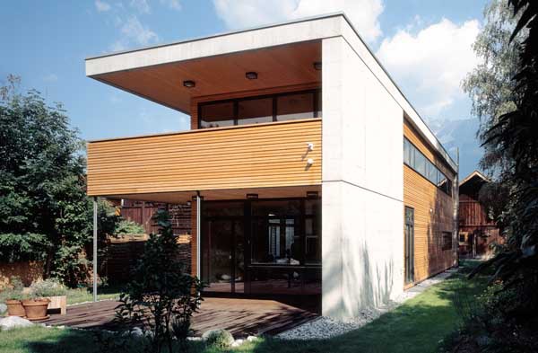 Durch die schmale langgezogene Grundstücksform war der Prozess der Formfindung eingeschränkt. Der schmale, rechteckige Baukörper resultierte aus dem geforderten Raumprogramm und dem Bestreben einen möglichst großen Anteil an Grünflächen zu erhalten. Die Architektur des Niedrigenergiehauses ist geprägt durch ein abwechslungsreiches Spiel der Holz- und Betonoberfläche. Bei diesem Einfamilienhaus wurde der klassische Blockhausbau unter Einsatz modernster Holzverarbeitungstechnologien neu interpretiert.