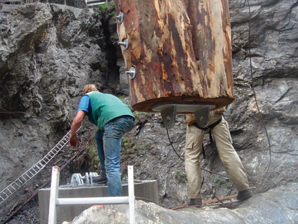 Wegen komplexen geologischen Bodenverhältnissen musste ein Teil der Steganglagen der Kitzlochklamm auf das linke Ufer der Rauriser Ache verlegt werden. Als Verbindung war eine Brücke erforderlich, die in 12 Meter Höhe über die Ache führen sollte. Zu den räumlichen schwierigen Bedingungen (nur ein Wanderweg führt in die Klamm, der Mittelpfeiler der Brücke musste auf einen Felsen mitten im hoch- bzw. schmelzwasserführenden Fluss montiert werden,…) kamen auch formale Gegebenheiten, die es zu erfüllen galt: Aufgrund der Situierung inmitten der Naturklamm musste auf industriell gefertigte Brettschichthölzer verzichtet werden. Man entschloss sich für die Verwendung von Lärchenholz, wobei die Bearbeitung der bis zu 12 m langen Rundstämme eine handwerkliche bzw. holzbautechnische Herausforderung darstellte (Lärche hat eine hohe Abholzigkeit: je länger der Stamm, umso größer der Unterschied im Durchmesser der beiden Stammenden). Der Brückenlauf wurde geknickt, um die in der Klammschlucht anwirkenden Windkräfte als liegendes Dreieck auf die Widerlager hin abzuleiten.