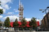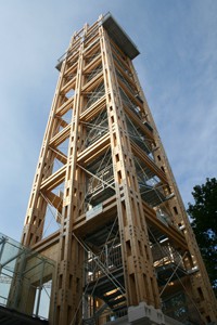 Die Holzkonstruktion wurde in vier Modulen (je bis zu 15 m hoch und 45 to schwer) am Boden vormontiert und mittels 400-Tonnen-Kran errichtet. Montagezeit 3 Wochen.