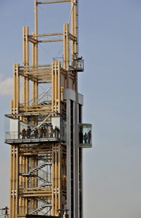 Die Besucherplattform in knapp 41 m Höhe wird mit zwei verglasten Panoramaliften und einer Treppenanlage erschlossen.