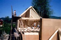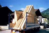 Das Einfamilienhaus Hofer mit Bürobereich in Salzburg entspricht dem Niedrigenergiehausstandard und wird mittels Erdwärme beheizt. Die Dachstuhlelemente wurden im Zimmereibetrieb vorgefertigt und per Kran vor Ort montiert.