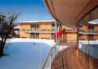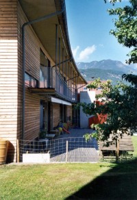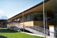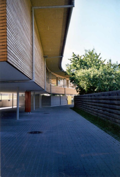Dieses aus zwei Baukörpern bestehende Objekt ist in Mischbauweise errichtet. Die Holztafeln sind dabei als aussteifende Elemente in einen zweigeschossigen Stahlrahmen eingesetzt. Das Objekt erfüllt den Energiesparstandard.