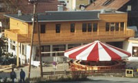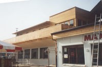 Die Aufstockung des Gastronomiebetriebs Hubertusklause in St. Johann in Tirol ist in Holzbauweise erfolgt. Die Fassade zeigt eine Lärchenschalung, die durch eine lamellenartige Konstruktion Wasser ableitet.