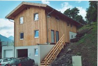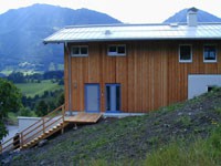 Das in Skelettbauweise errichtete Niedrigenergiehaus in St. Veit im Pongau zeigt an der Fassade eine Deckleistenschalung in Lärche und im Wohnraum einen Sichtdachstuhl.