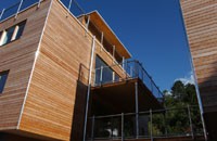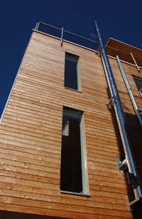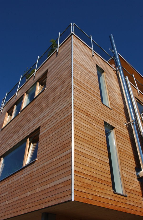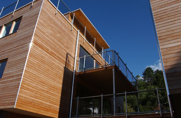 Die Reihenhausanlage in Sistrans zeigt eine weitere Variante des Typs Wohnbox von HOLZ BOX TIROL. Die klare Formensprache der Architektur wird durch die Horizontalschalung mit offener Fuge unterstrichen.