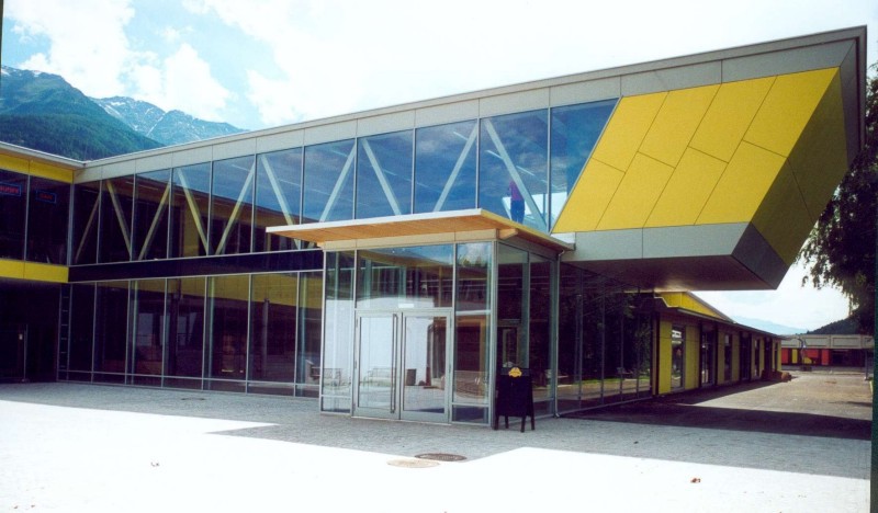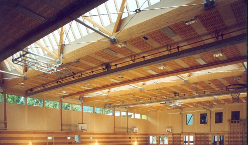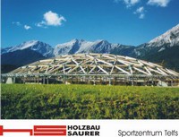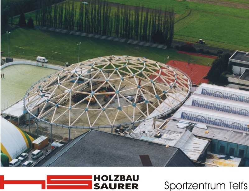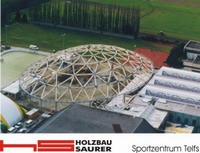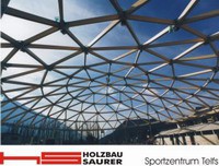 Das Sportzentrum besteht aus drei Komplexen: die Sporthalle, die Kuppelkonstruktion und der Foyer - Kegelbahnbereich. Die Bauweise kann generell als Mischbau bezeichnet werden, so kommt bei der Kuppelkonstruktion Holz mit Stahl und beim Foyer Holz mit Beton zum Einsatz. Interessant ist auch das energetische Gesamtkonzept, daß auf dem Niedrigenergiestandard beruht.