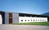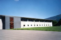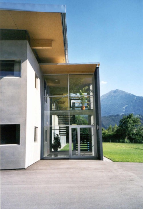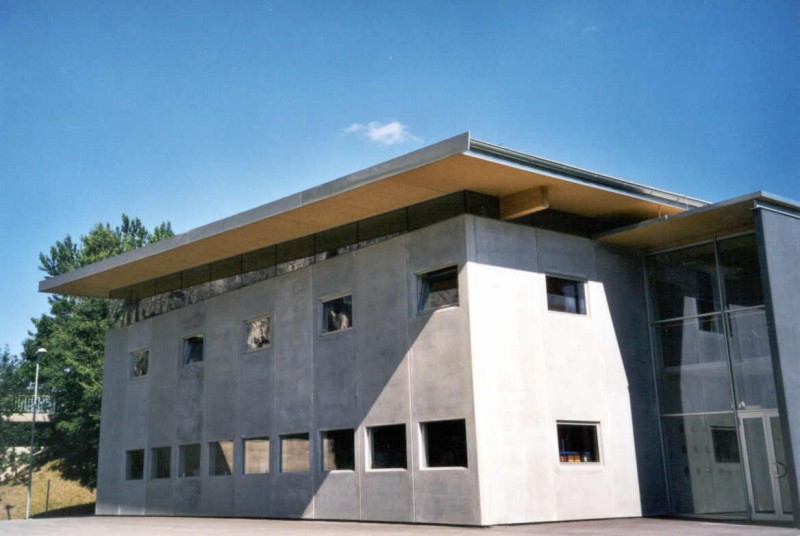 Errichtet in Mischbauweise. Der Pultdachträger wird dabei auf Stahlbetonstützen in eine Gabellagerung eingesetzt, das Dach besteht aus einfeldrigen Holztafelelementen.