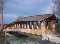 Zum Ende des 2. Weltkrieges wurde die ehemalige Brücke über die Saalach zwischen Wals-Siezenheim (A) und Ainring (D) zerstört. 2001 gelang es mit EU-Mitteln eine neue, völkerverbindende Fuß- und Radwegbrücke zu errichten. Sie ist dem grenzüberschreitenden Europagedanken gewidmet, der die Menschen der Regionen vereinen soll. Die Tragwerkskonstruktion könnte als exzentrisches Fachwerk bezeichnet werden, da, anders als bei einer klassischen Fachwerkskonstruktion, die Untergurte auch Biegemomente aufnehmen müssen. Diese resultieren aus dem großen Querschnitt des Untergurts sowie aus der bogenförmigen Überhöhung von 150 cm. Wegen Hochwassergefährdung wurde eine Strompfeilerfreie Konstruktion gewählt, die sich über knapp 70 m erstreckt und so in Europa zu den Holzbrücken mit den längsten Spannweiten zählt. Gesamtkosten: € 764.700 Brückenklasse: Fußgänger-Radwegbrücke Klasse I