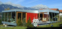 Rot lasierte 3-Schichtplatten aus Lärche sowie eine Aluverkleidung setzen farbliche Akzente am Einfamilienhaus in Stams/Tirol. Lehmputz dominiert das Erscheinungsbild in den Innenräumen.