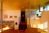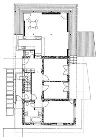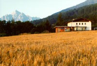 Konträr in Formensprache und Material zeigt sich der Zu- und Umbau des Mehrfamilienhauses A./F. in Raitis. Einzig eine horizontale Betonplatte bildet eine Verbindung beider Bauten. Die alte Ortbetonplattendecke wurde in derselben Schlankheit als Dach des Zubaues weitergeführt. Die rundum auskragende Platte ist auf 9 Stahlstützen gelagert und thermisch getrennt von der leichten lichtdurchfluteten Holzbox - ein Holzriegelbau mit Holzbalkenkonstruktion. Fensterflächen sind zu einem großen Teil Fixverglasungen, alle öffenbaren Elemente sind holzgerahmt. Schiebeläden aus Lärchenholzlamellen filtern das einfallende Sonnenlicht.