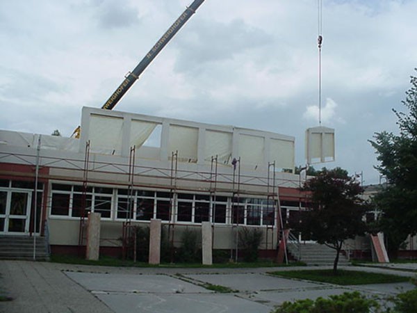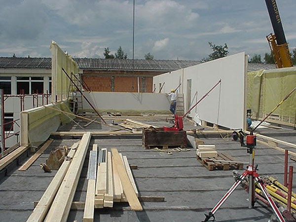 Die Aufstockung des nicht unterkellerten ebenerdigen Garderobentrakts zwischen Volks- und Hauptschule erfolgte in Holzbauweise.