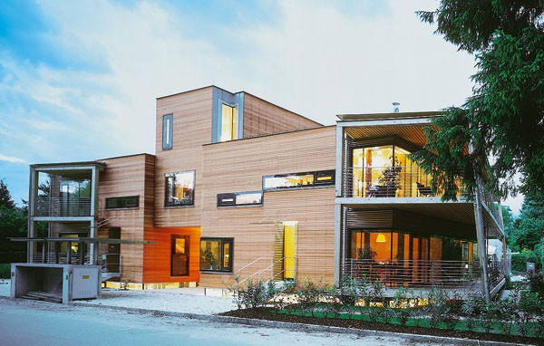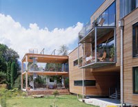 Das Mehrfamilienhaus "Möbel in der Landschaft" ist ein gemeinsames Projekt von drei Familien. Die Optimierung des Grundanteils und der Baukosten ohne Verlust der Wohnqualität stand im Vordergrund sowie die eigenen Interessen der Familie neben den Vorteilen des Gemeinsamen zu nutzen. Jeder Bauteil ist wie ein Einfamilienhaus umgehbar, zusätzlich sind alle Geschoße an den Garten mittels großen Veranden direkt angebunden. Der Holzbau entsprach den Anforderungen der Familien hinsichtlich der Reduktion der Energiekosten, der Wunsch nach unbehandelten Naturstoffen, der großzügigen Flächen der Veranden und der Wohnatmosphäre. Das Ergebnis ist ein reiner dreigeschoßiger Holzbau.