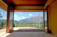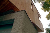 Altengerechtes Wohnen nicht bei, sondern in unmittelbarer Nähe der Familie ist ein Konzept, das der alten bäuerlichen Tradition des "Austraghauses" folgt. Den Bedürfnissen entsprechend wurde ein möglichst kompakter Baukörper aus Holz in Niedrigenergiebauweise errichtet, welcher eine Wohnnutzfläche von 50m² umfasst. Die Lage des kleinen Häuschens bildet im Zusammenspiel mit dem bestehenden Haus einen Innenhof als Kommunikationsbereich. Die Privatsphäre der jeweiligen Bewohner ist ungestört, ohne jedoch den direkten und für beide Teile vorteilhaften Kontakt innerhalb der Familie zu verlieren. Da die Bewohnerin gehbehindert ist, wurde zwischen dem Massivbaukörper im Untergeschoss und der Garage, dem Lager und dem darüberliegenden Holzbaukörper im Erdgeschoss ein Lift als eigenständiges Element eingebaut. Der hangberührende Baukörper folgt den Höhenschichtslinien. Dadurch ergab sich ein schmaler, jedoch gut nutzbarer Abstellraum. Um die Energieeffizienz möglichst groß zu halten, wurde der quadratische Holzbaukörper im Erdgeschoss hermetisch nach allen Seiten hin hochwärmegedämmt. Die Kellermauern wurden innen und außen mit sehr grobem Außenputz versehen. In seiner natürlichen Form belassen - nicht gefärbt - bildet dieser Putz einen Kontrast zu den glatten Lärchenholztafeln des darüberliegenden Erdgeschosses. Das Gitter als Außenverkleidung des Liftturms ist eine Analogie zu Felssicherungen im Straßenbau. Efeu wurde am Fuß des Liftturms gepflanzt, um das Gitter überwachsen zu lassen. Lichtstrahler akzentuieren diese grüne Form auch nachts.