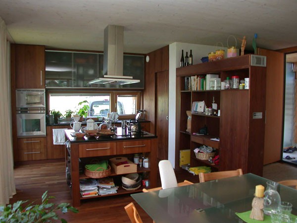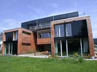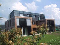 Zwei dominante Randbaukörper mit einem darüberliegenden Querbaukörper an dem ein Zwischenbaukörper abgehängt ist. Schlichte einfache verschindelte Baukörper mit abgerundeten Ecken, die nach Süden orientiert sind. Der Dachbaukörper ist mit Kollektoren versehen. Das Dach zieht sich über die Nordwand herunter.
