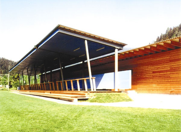 Eine räumliche Spannung entsteht zwischen den beiden ineinander verschobenen langgestreckten Kuben (jeweils ca. 49mx7m) des Gebäudes und Tribünendaches. Die Entscheidung für eine Holzkonstruktion fiel aufgrund von Charakter und Leichtigkeit des Materials, welches für Bauaufgabe und Ort angemessen erschien. Durch das Konstruktionsraster konnten standardisierte Bauteilformate verwendet und damit Kostenvorteile erreicht werden. Fenster und Türen folgen dem Raster. Die Vorfertigung der Bauelemente ermöglichte eine schnelle Errichtung des Gebäudes.