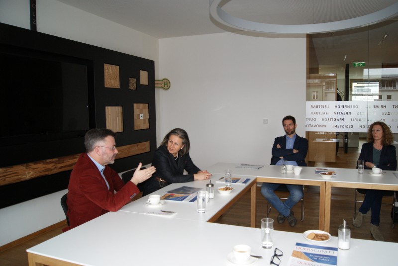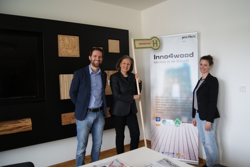 Dieses Thema bearbeitet im Geschäftsfeld Holzcluster bei proHolz Tirol Eva Moser gemeinsam mit KollegInnen aus Bayern im Rahmen des Interreg-Projekts Inno4wood Fokus dieses regionenübergreifenden Projekts ist das Herausarbeiten von Innovationen bzw. Innovationskultur in der Forst- und Holzwirtschaft. Die Landesrätin zeigte sich sehr interessiert und freut sich auf Detailergebnisse, die am Projektende präsentiert werden.