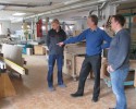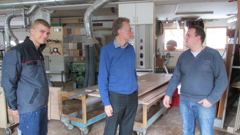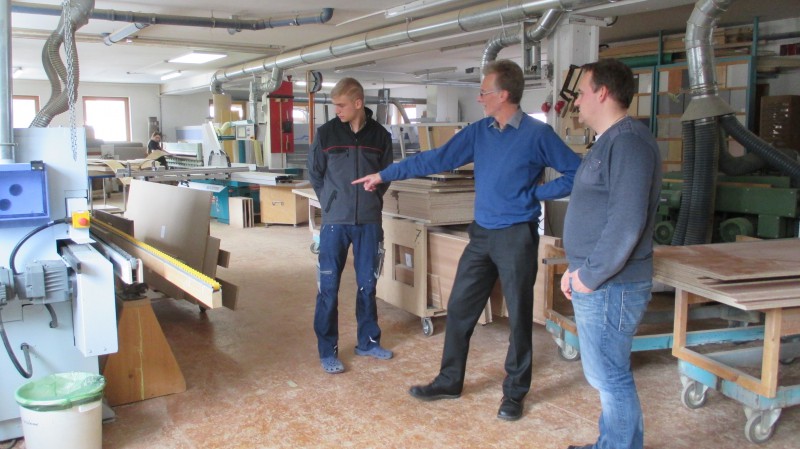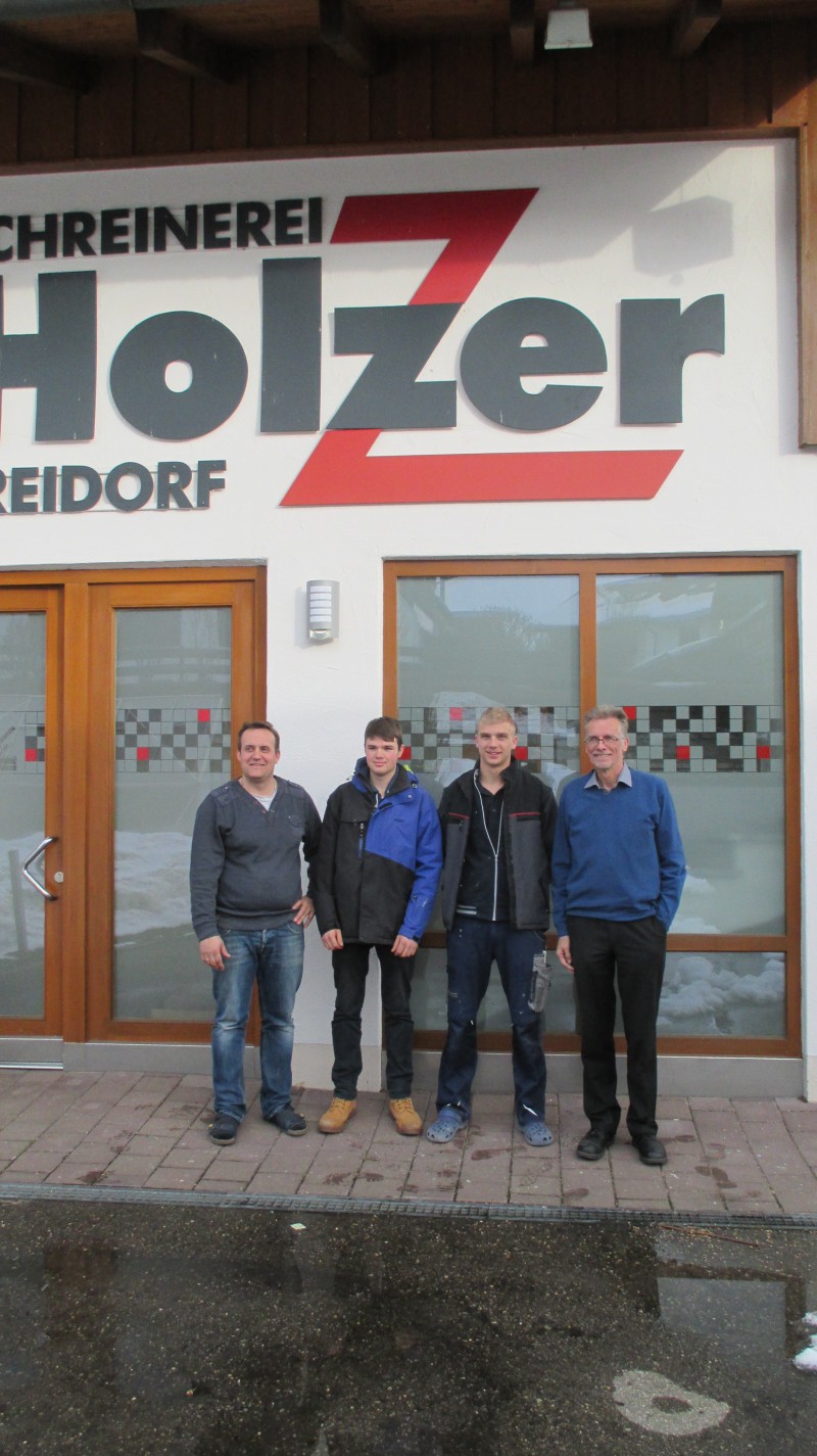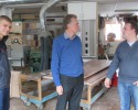 Gemeinsam mit Firmenchef Heinrich Auer (Holzmanufaktur Auer, Innsbruck) und seinem Lehrling Martin Saumweber besuchten wir die Schreinerei Holzer von Stefan Holzer in Rettenberg im Allgäu. Um einen ersten Eindruck des Partnerbetriebs zu bekommen besichtigten wir gleich nach Ankunft die Werkstatt, in der auch sofort eifrig über die einzelnen Maschinen gefachsimpelt wurde.