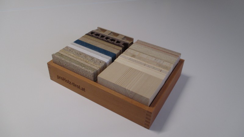 Die Holzmusterbox 'Holzwerkstoffe' enthält Muster von 25 Holzwerkstoffen und ergänzenden Bauwerkstoffen. Diese Holzmusterbox kann zum Stückpreis von EUR 65,— zuzüglich Verpackungs- und Versandkosten (€ 9,80 Inland) bezogen werden.