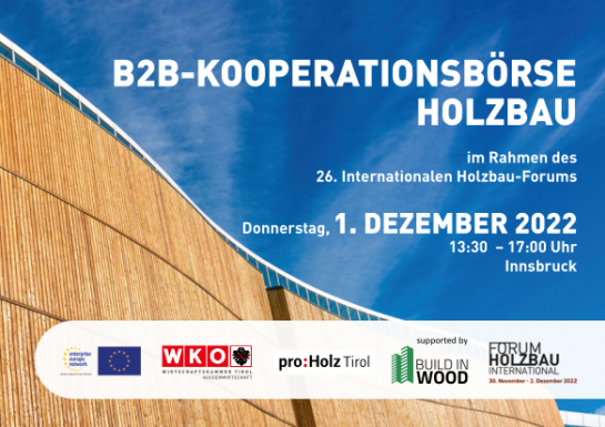 Die Wirtschaftskammer Tirol, das Enterprise Europe Network und proHolz Tirol laden Sie herzlich zur B2B-Kooperationsbörse Holzbau im Rahmen des 26. Internationalen Holzbau-Forums (IHF) in Innsbruck ein. Nützen Sie die Gelegenheit, Gespräche mit Firmenvertretern und öffentlichen Entscheidungsträgern im Bereich Holzbau zu führen, Geschäftspartner für Ihren Markteintritt im Ausland zu finden, Know-how auszutauschen, neue Verfahren und Produkte kennenzulernen…