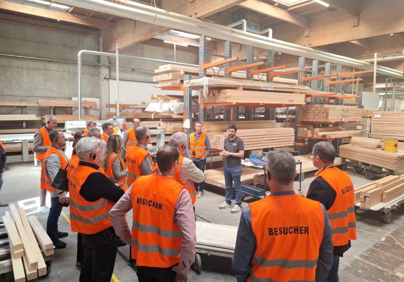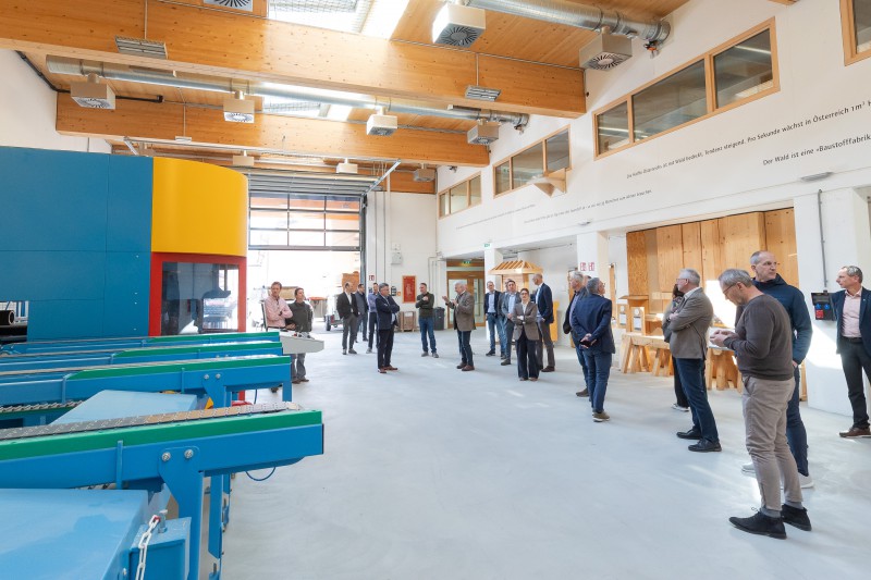 Bild 4: Direktor Christian Margreiter (TFBS für Holztechnik) führt seine Gäste durch das „TiroLignum - Forschungs- und Bildungswerkstatt Holz“ in Absam.