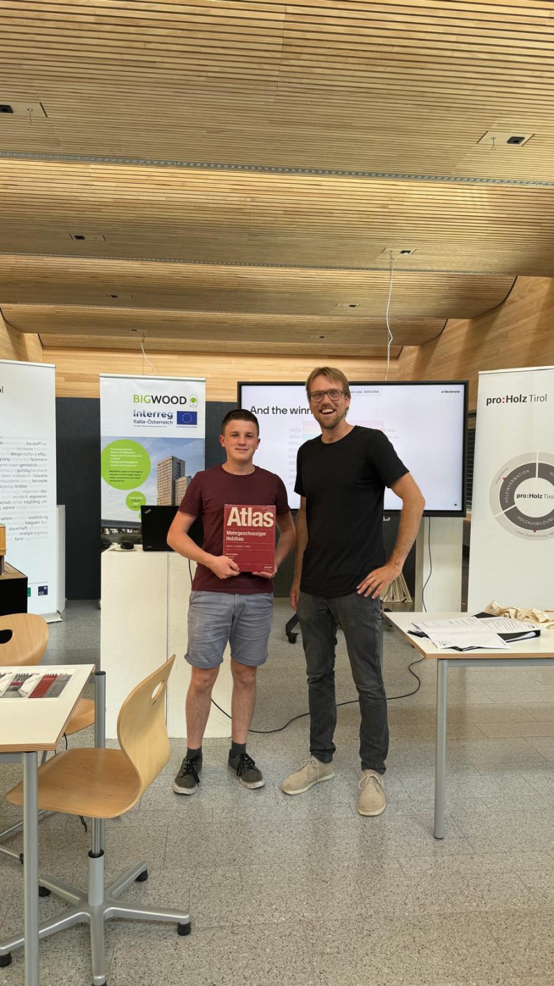 Abschluss und Preisverleihung: Zum Abschluss der Veranstaltung fand ein Quiz statt, bei dem der Sieger einen "Atlas Mehrgeschossiger Holzbau" erhielt. Als kleines Dankeschön erhielten alle Teilnehmer*innen Broschüren zum Holzbaupreis Tirol, sowie weitere Give-Aways und Informationen zum Interreg Projekt BIGWOOD.