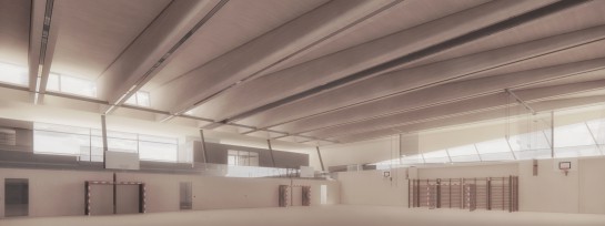 Die Sporthalle bildet das Herzstück des neuen Ortsteilzentrums und verbindet Schule, Wohnbebauung und Parklandschaft.