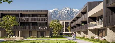 Das derzeit in der Ausführung befindliche Bauvorhaben umfasst fünf kompakte Baukörper mit 18 Mietwohnungen, 40 Eigentumswohnungen und sechs Reihenhäuser. Die komplette Wohnanlage bleibt im oberirdischen Bereich autofrei und bietet großzügige Grün- und Aufenthaltsbereiche. Die einzelnen Häuser werden in Holz- bzw. Hybridbauweise errichtet. Auch die Energieversorgung ist mit einem Fernwärmeanschluss sowie einer zentralen Luft-Wasser-Wärmepumpe besonders nachhaltig und klimafreundlich.