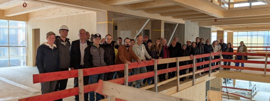 Der gewählte Besichtigungstermin ermöglichte einen optimalen Einblick in die innovative Holzkonstruktion: Während die Tragstruktur bereits fertiggestellt war, hatte der Innenausbau noch nicht begonnen.