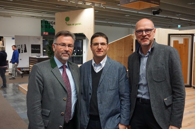 Bild 2: (v.l.n.r.) proHolz Tirol-Geschäftsführer Rüdiger Lex mit den beiden Tischlern Bezirksinnungsmeister Friedrich Wieser aus Strassen/Osttirol und Landesinnungsmeister Klaus Buchauer aus Ebbs.