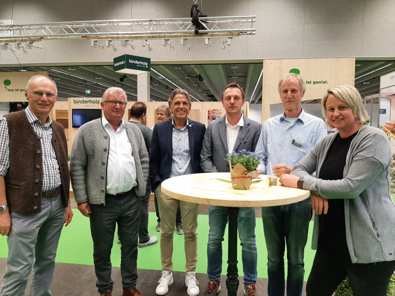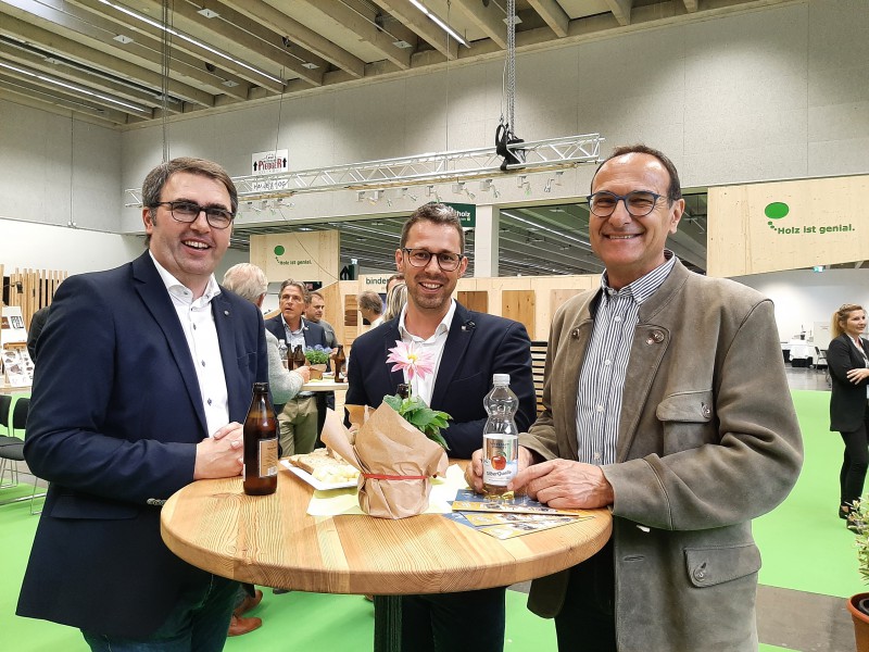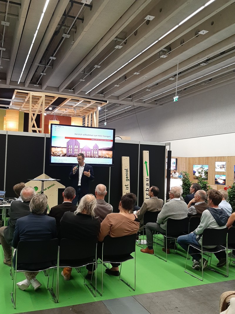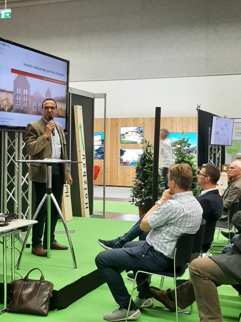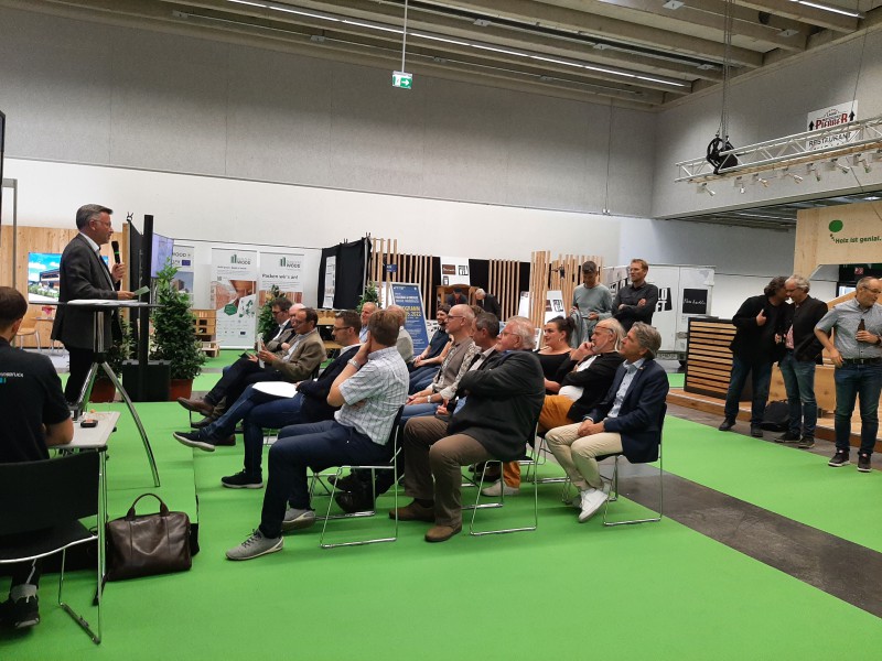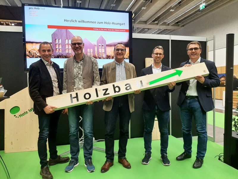 Im Rahmen der Tiroler Hausbau & Energie Messe traf sich die Tiroler Holz-Szene am 13. Mai 2022 zum bereits traditionellen „Holz-Hoangart“ im „Holz ist genial“-Areal. Eröffnet wurde die Veranstaltung nach einführenden Worten von proHolz Tirol-Geschäftsführer Rüdiger Lex mit einem Impulsvortrag unter dem Titel „Die Tiroler Nachhaltigkeits- und Klimastrategie – neue Chancen für den Holzbau“. Es referierten proHolz-Vorstandsmitglied Kurt Ziegner und Thomas Schnitzer-Osl, beide Land Tirol. Unter dem Motto „Leben mit Zukunft“ entwickelte die Tiroler Landesregierung eine neue Nachhaltigkeits- und Klimastrategie, in der der Holzbau konkret berücksichtigt wird. “Die gesamte Wertschöpfungskette Forst-Holz leistet bei einer hochwertigen und langfristigen Verwendung von Holzprodukten einen wesentlichen Beitrag zum Klimaschutz. Maßnahmen, wie Ausbildungsoffensiven und eine vermehrte Verwendung von Holz auch bei großvolumigen Neubauten, können durch gezielte Förderungen als Investition in eine energie- und CO2-neutrale Zukunft des Landes Tirol betrachtet werden”, so die Vortragenden. Die TeilnehmerInnen zeigten sich erfreut, teilweise überrascht darüber, welchen Stellenwert die Holzverwendung mittlerweile auch auf politischer Ebene einnimmt. Im Anschluss an den Vortrag wurde in gemütlicher Runde und bei einer traditionellen Tiroler Jause über das ein oder andere mehr gefachsimpelt.