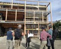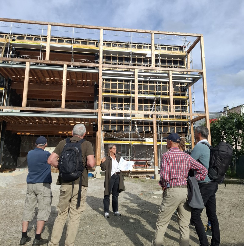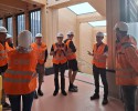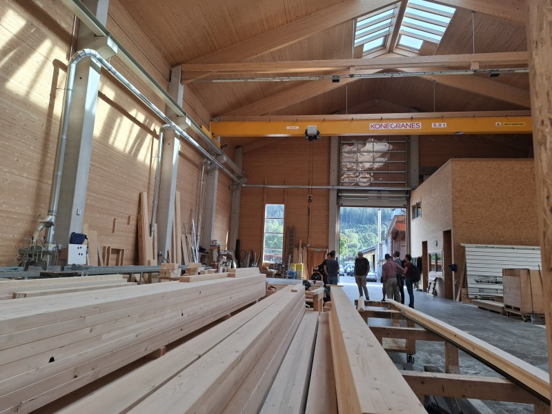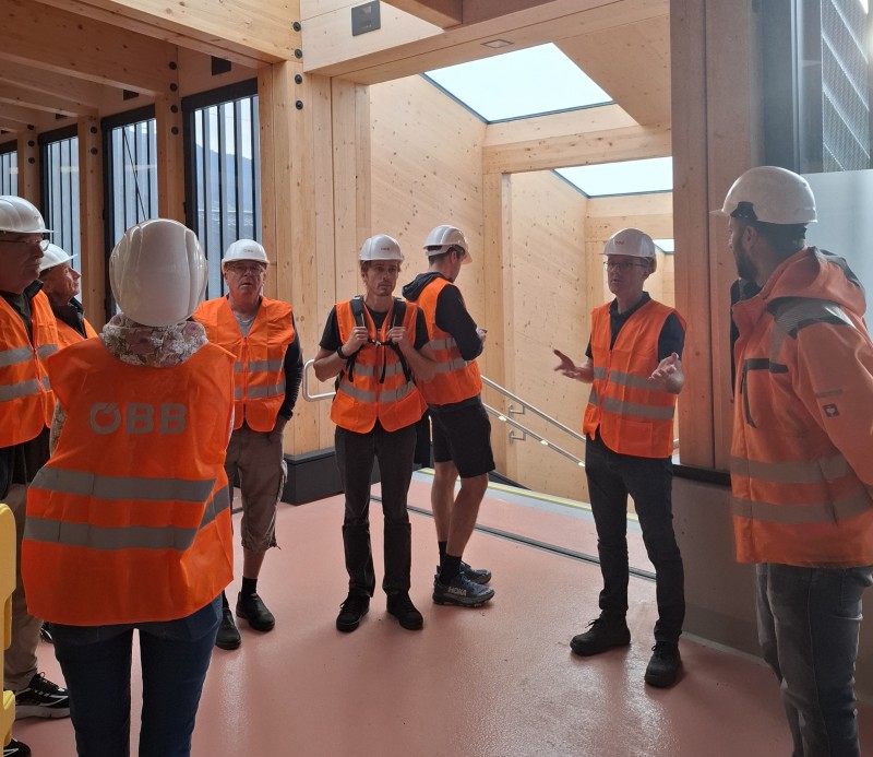 Die Route führte vom Projekt MPreis und Wohnen in Volders über einen Besuch bei Posch Holzbau GmbH, weiter zur Volksschule am Kirchplatz in Wattens und schließlich zum neuen Bahnhof Fritzens-Wattens. Die Mischung aus fertiggestellten Objekten, laufenden Baustellen und spannenden Hintergrundgesprächen zeigte eindrucksvoll die Bandbreite des Bauens mit Holz – von Gewerbe und Wohnen über Bildungsbauten bis hin zu Infrastrukturprojekten.