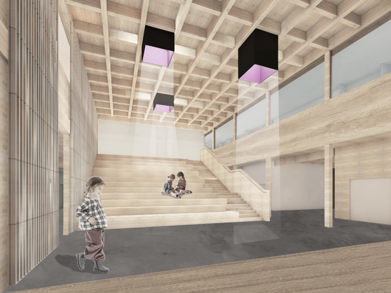 Auf der Baustelle des neuen Schulzentrums Bad Endorf informierten Architekt Florian Müller-Luckinger und sein Team über den Einsatz von regionalem Holz für Grund- und Mittelschule sowie Hort. Großzügige Begegnungszonen schaffen ein modernes, nachhaltiges Lernumfeld.