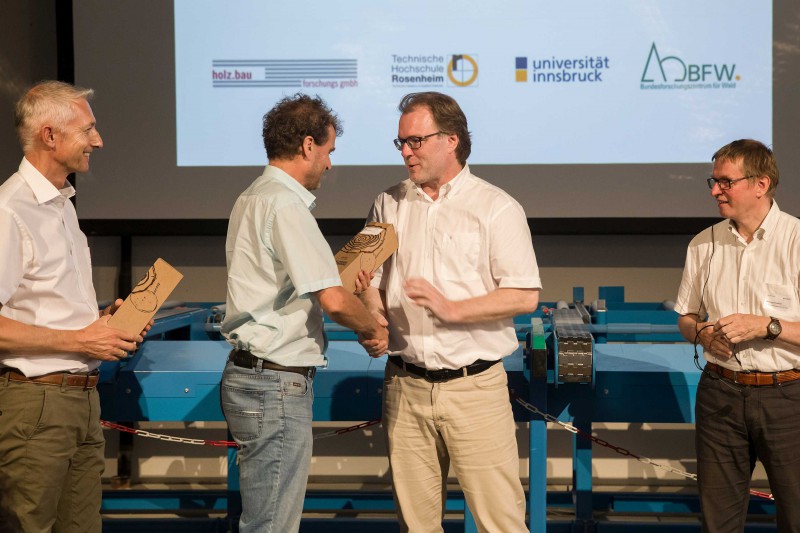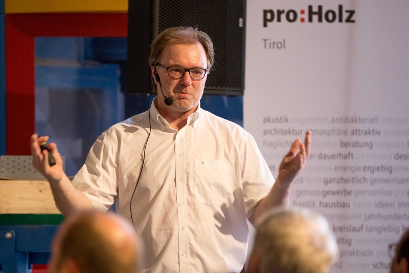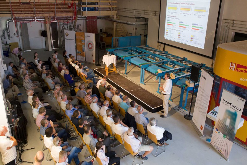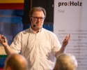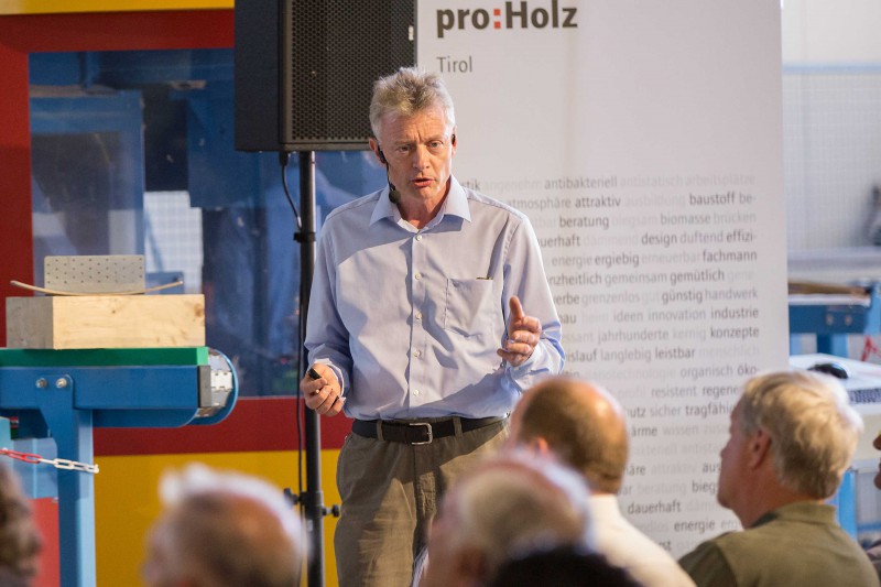 Im Anschluss an die Holzolympiade wurden beim Branchentag im Ti-roLignum – Forschungs- und Bildungswerkstatt Holz – Gäste aus dem In- und benachbarten Ausland empfangen. Ausgewählte Forschungsein-richtungen gaben dabei spannende Einblicke in ihre Institutionen und Arbeitsschwerpunkte. Nach den Eröffnungsworten von LHStv. ÖR Josef Geisler und proHolz-Vorstandsvorsitzendem Karl Schafferer startete Manfred Augustin von der holz.bau forschungs gmbH aus Graz die Vortragsreihe mit dem Thema „Deckensysteme aus Holz – Forschung & Entwicklung in der Steiermark“. Wie Holzfasern zur Herstellung neuer Werkstoffe verwendet werden können zeigte Prof. Dr. Andreas Michanickl von der Technischen Hochschule Rosenheim auf. Dr. Roland Maderebner von der Technischen Versuchs- und Forschungsanstalt der Universität Innsbruck stellte in einem anschaulichen Vortrag Verbindungsmittel im Holzbau – wie etwa den Spider Connector – vor. Das Thema Wald und wie unerschöpflich Holz tatsächlich ist, erörterte schließlich Dr. Klemens Schadauer vom Bundesforschungszentrum für Wald aus Wien.