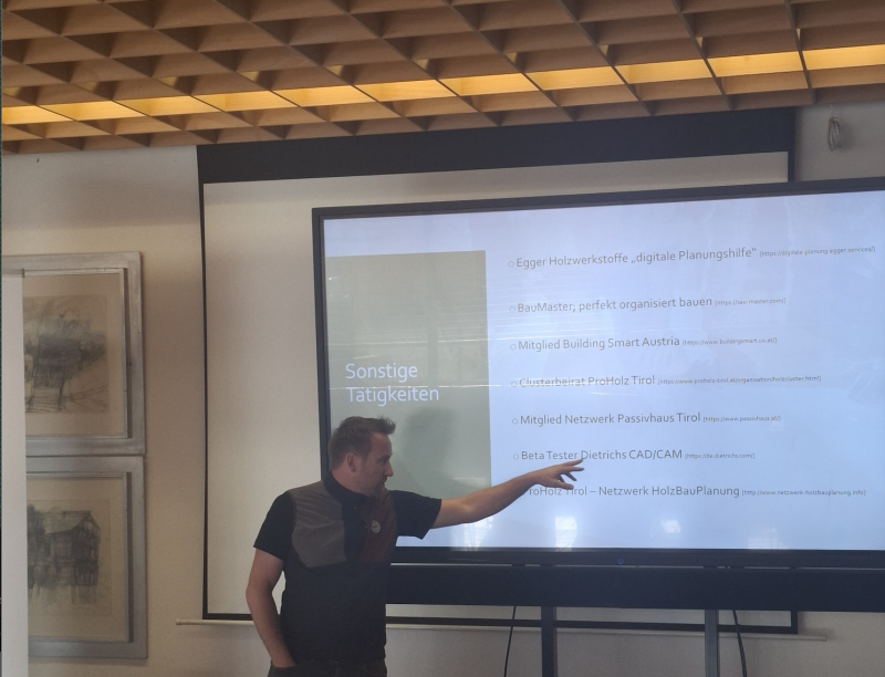Nach einer kurzen Pause stellte Julian Oberhofer, Mitarbeiter von proHolz Tirol das BIGWOOD Planungstool vor. Bernhard Wörter vom Planungsbüro HolzTec zeigte anschließend Praxisbeispiele der Holzbauplanung und umgesetzte Projekte aus seinem Büro. Auch das kürzlich gegründete Netzwerk HolzBauPlanung, das die moderne Holzbauweise weiterentwickeln will, wurde den Teilnehmer*innen präsentiert.