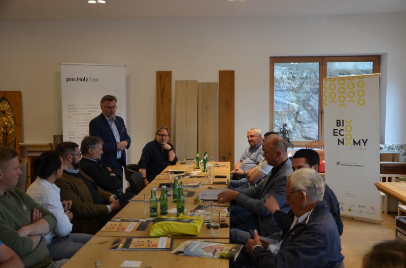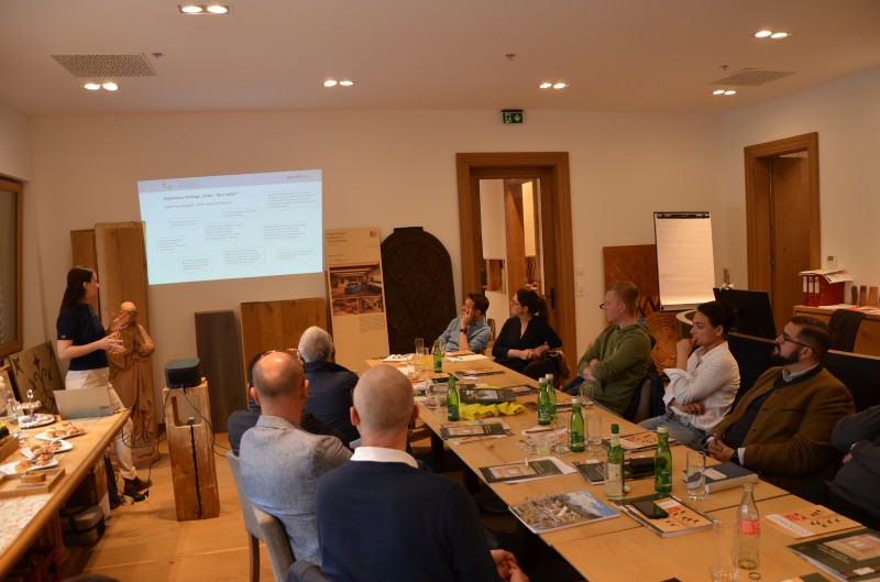 Zu Beginn bekamen die Teilnehmer*innen (vorwiegend Anbieter aus dem Netzwerk Zirbe - zirbe.info) von Gastgeber Markus Decker eine Führung durch den innovativen Betrieb. Im anschließenden Workshop wurde über Kundenbedürfnisse, Herausforderungen, Chancen und Ideen in Bezug auf die Holzart gesprochen. Die Zirbe ist ein Vorzeigebeispiel für die wertgerechte Verwendung von Holz – ein Thema, dem sich proHolz Tirol aktuell im Projekt „Bioeconomy Austria“ widmet. In den 1990er-Jahren war sie fast in Vergessenheit geraten, doch durch gezielte Marketingmaßnahmen und Storytelling erlangte die „Königin der Alpen“ neue Bekanntheit. Seitdem ist der Trend ungebrochen und die Nachfrage liegt nach wie vor auf einem hohen Niveau. Ihre Farbe, die Maserung und der Geruch machen die Zirbe zu einem Holz mit Charakter. Sie zeichnet sich durch ihre Widerstandsfähigkeit aus und wächst auf alpinen Bergrücken und felsigen Hängen. Die Baumart kommt im gesamten Alpenraum vor, wobei in Tirol fast die Hälfte des alpinen Zirbenvorkommens beheimatet ist. Durch die in Österreich gesetzlich vorgeschriebene nachhaltige Forstwirtschaft wird nicht mehr Zirbenholz geerntet als nachwächst. Auch das trägt zu ihrer Beliebtheit bei.